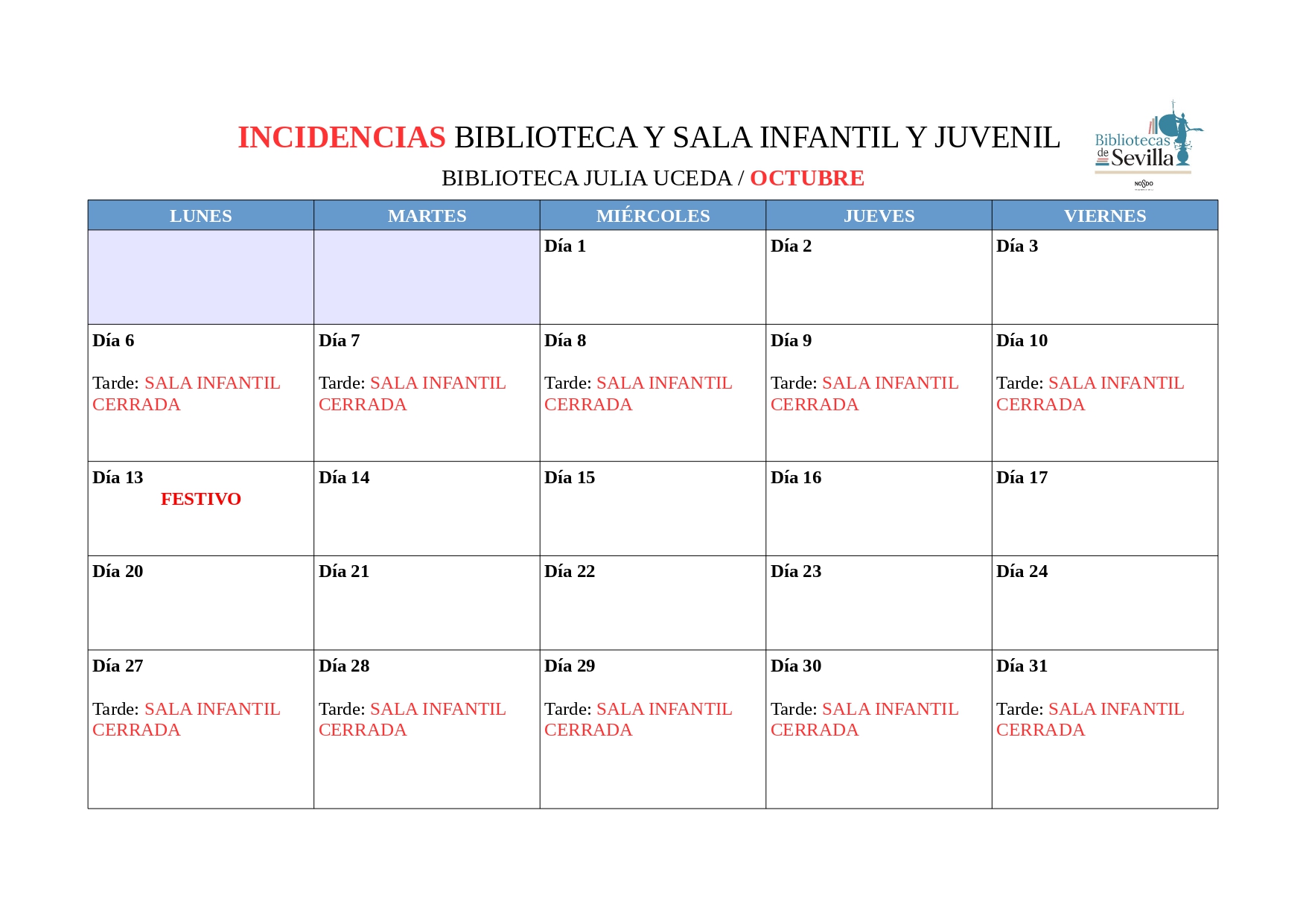 En el siguiente calendario se indican las incidencias de la biblioteca. Principalmente, afectan a la sala infantil y juvenil. Disculpen las molestias.