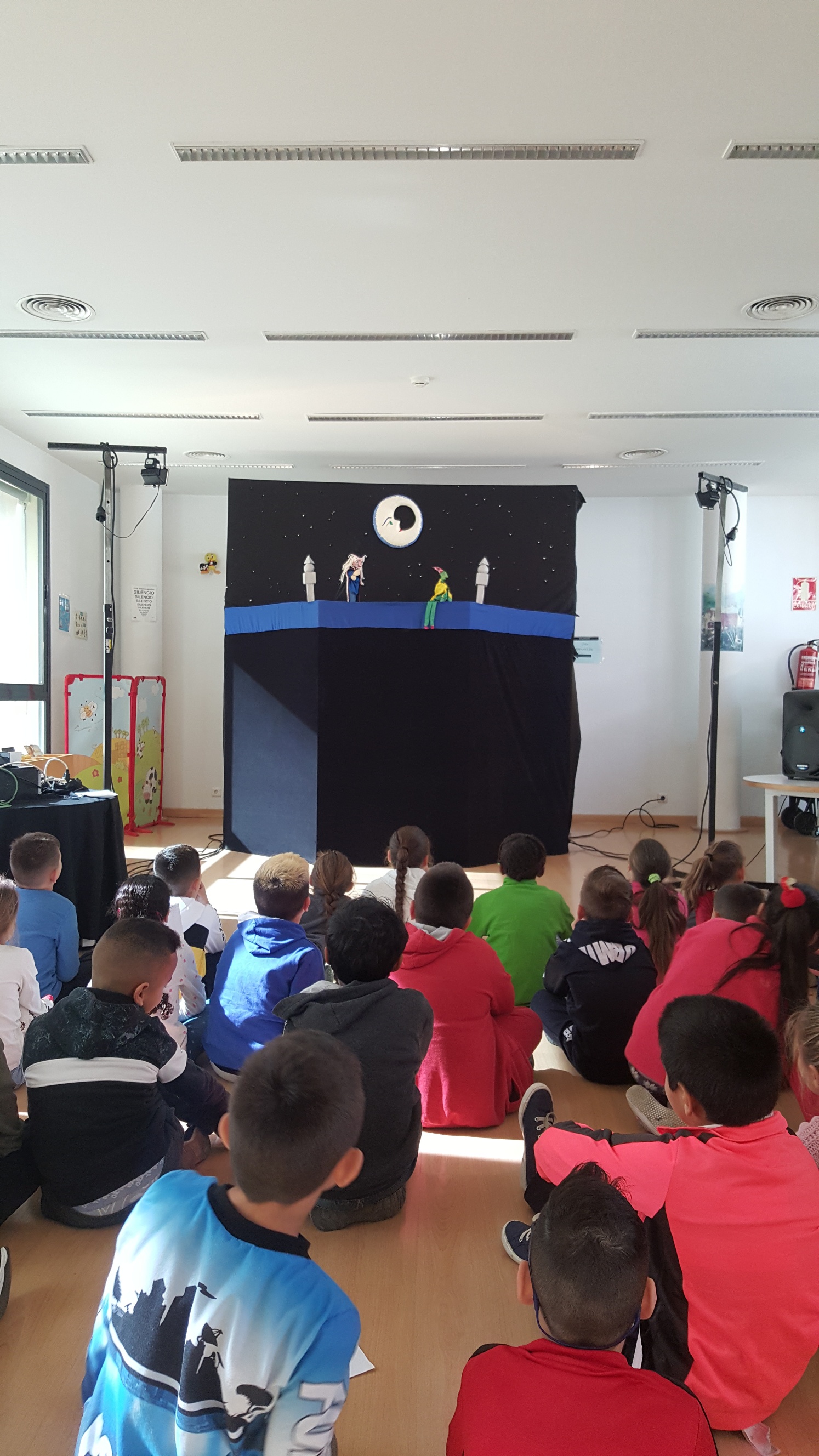 Todos estos personajes han venido esta mañana a la Biblioteca Torreblanca para disfrutar de este Día Internacional de la Felicidad para reírnos de lo lindo con Atelana Teatro y su espectáculo de títeres: Te Cuento un Cuento y te Metes Dentro, además de disfrutar y descubrir poemas, estrofas, historias, versos, caracolas y sueños.