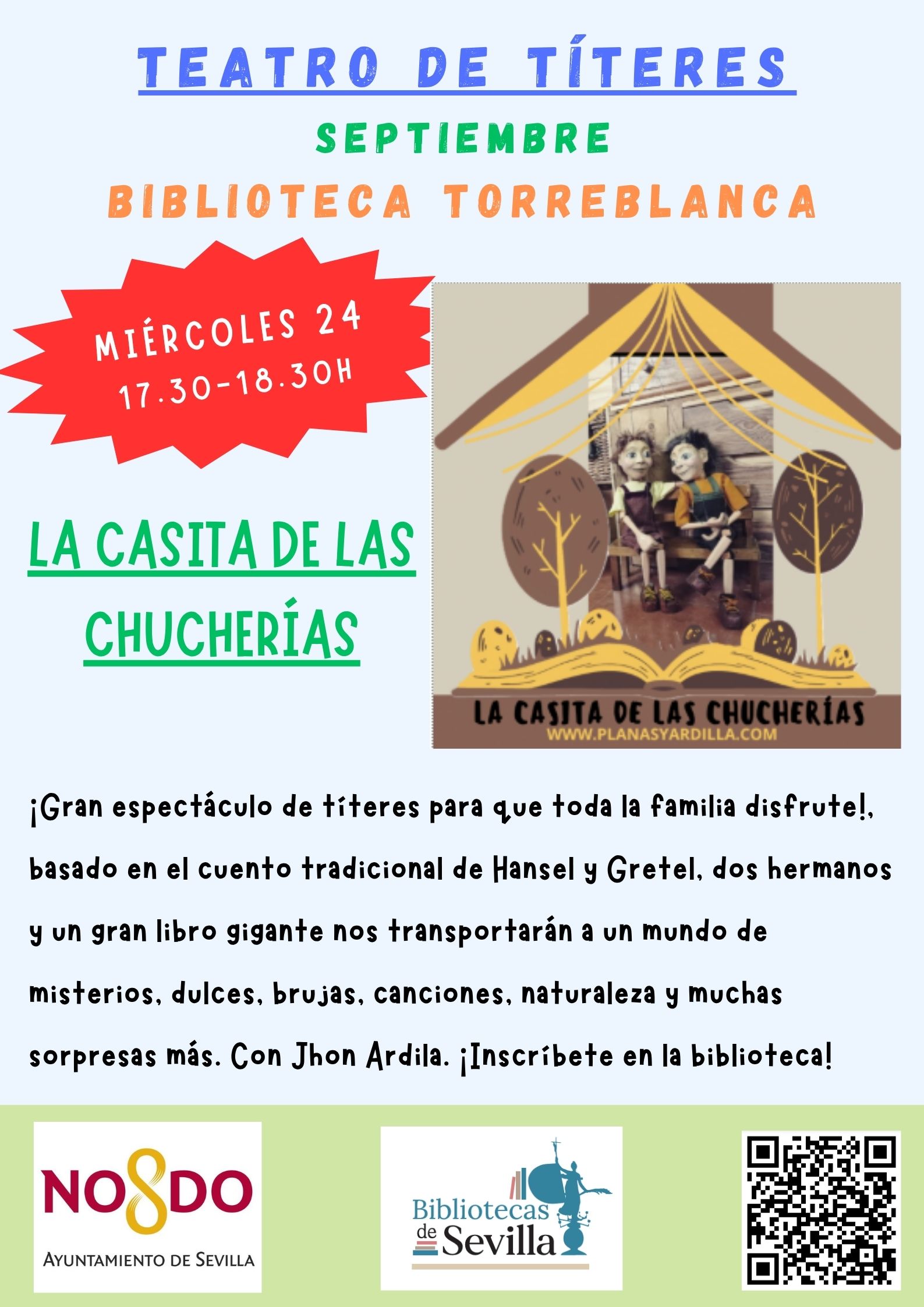Nuestra amiga Anabel Gandullo comenzará el 17 de septiembre con Letras la Poder: De ti depende la historia, y el miércoles siguiente, 24 de septiembre, nuestro amigo Jhon Ardila nos tiene una sorpresa preparada muy muy dulce con un espectáculo de títeres La casita de las chucherías, ambas a las 17.30 h. Inscribiros en la biblioteca y sed puntuales.