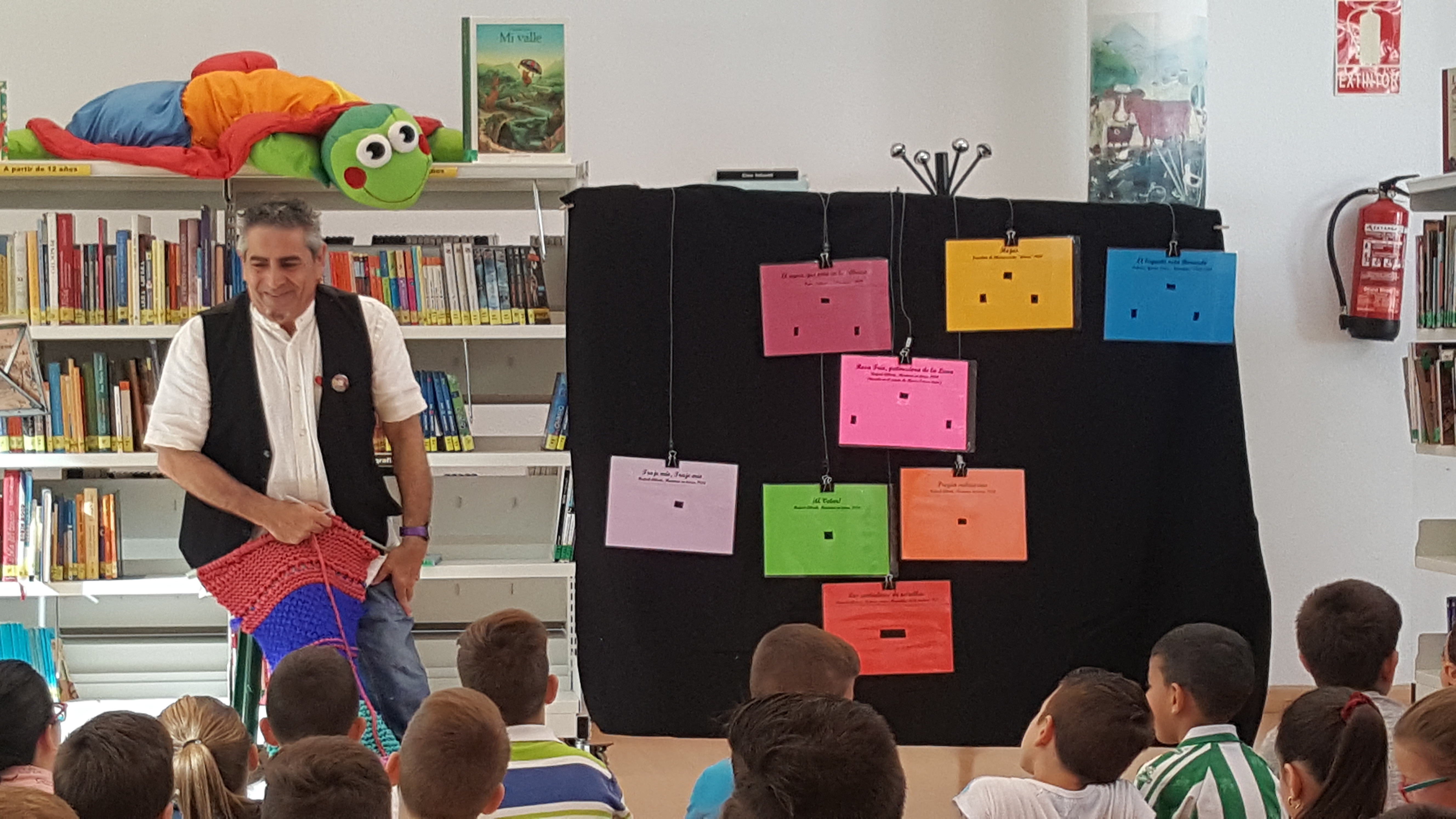 Este miércoles vino el calor de golpe, pero por la mañana PepePérez seguía con frio, pues tejía y tejía su bufanda con la compañía de los alumnos de 1º y 2º de Educación Primaria del CEIP Tierno Galván.