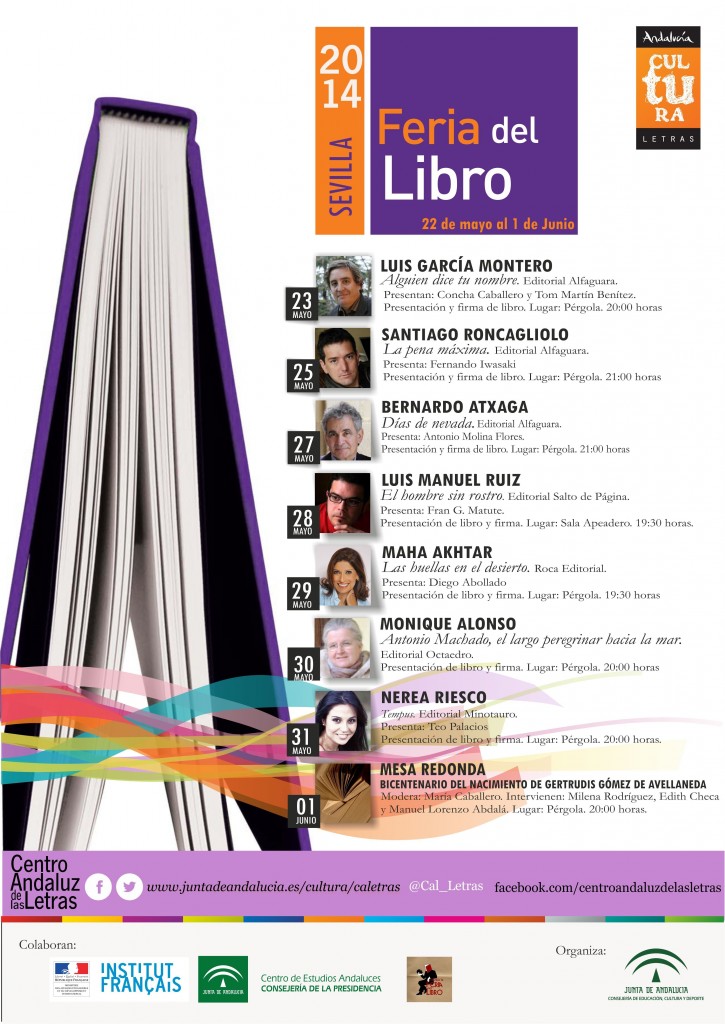 Os adjuntamos la programación del Centro Andaluz de las Letras en la Feria del Libro de Sevilla, que se desarrollará entre los días 22 de mayo y 1 de junio de 2014.