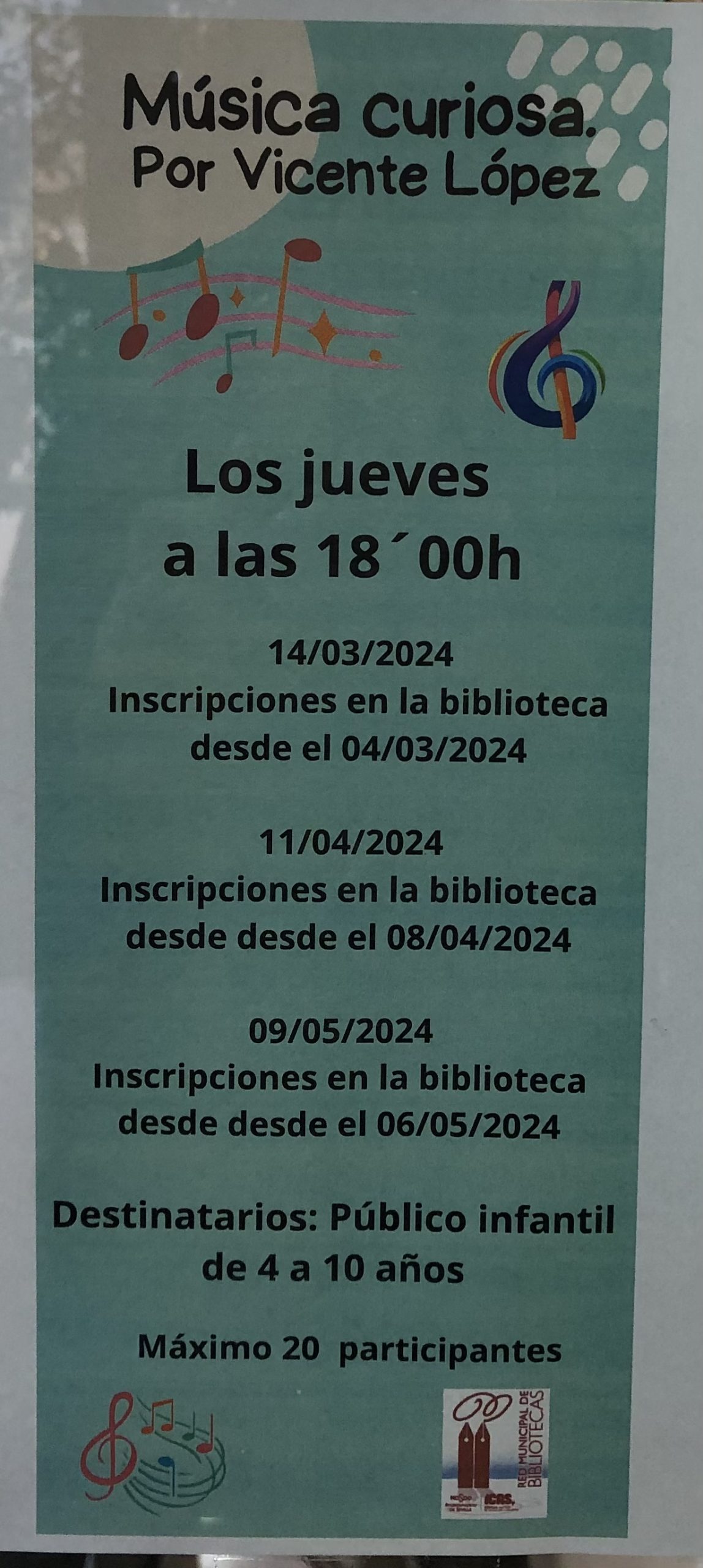 Destinada a público infantil de 4 a 10 años, Vicente López, llevará a cabo diferentes sesiones, dónde los asistentes, podrán , además de divertirse, interactuar entre ellos teniendo como fondo el maravilloso mundo de la música. La primera sesión será el día 14 de marzo a las 18´00h.