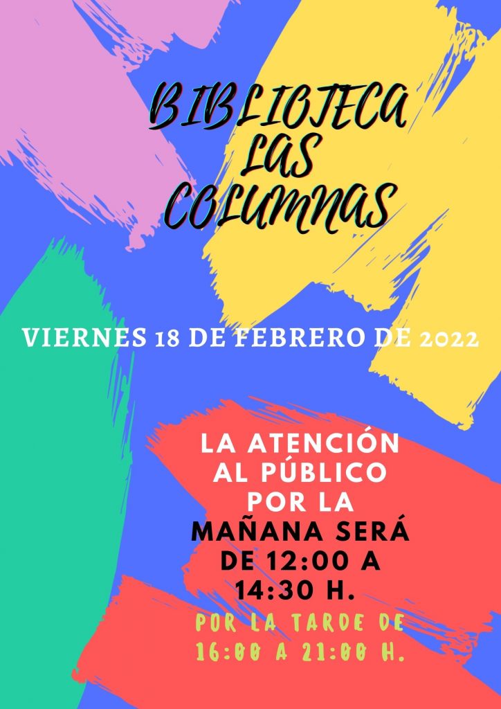 Por este motivo, el horario de atención al público de la biblioteca por la mañana, comenzará a las 12:00 h. y durará hasta las 14:30 h. Por la tarde seguirá el horario habitual, de 16:00 a 21:00 h.