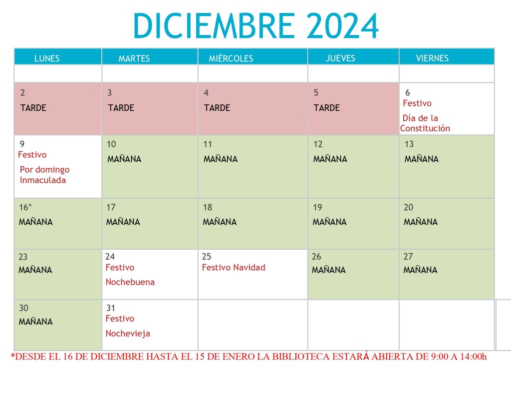 HORARIO DE LA BIBLIOTECA EN DICIEMBRE