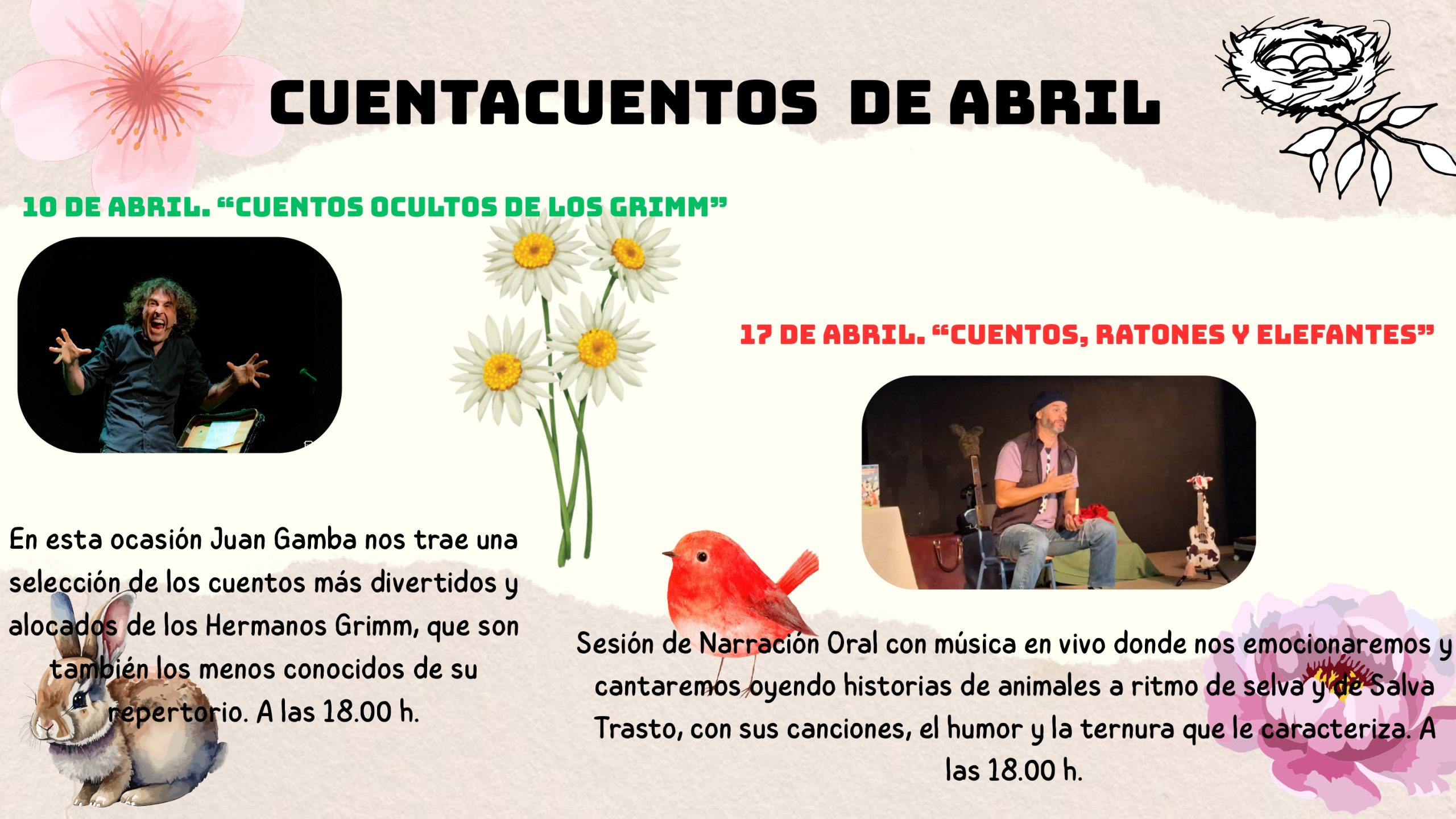 Después del pequeño descanso de la Semana Santa, en la Biblioteca Luis Cernuda retomaremos nuestro cuentacuentos de los viernes el día 10 de abril con el narrador madrileño Juan Gamba, que nos trae una recopilación de los cuentos menos conocidos de los Hermanos Grimm. A la siguiente semana, el día 17, estará con nosotros Salva Trasto para narrarnos un montón de historias de animales que acompañará con sus divertidas canciones al ritmo del vacalele. Para participar en cada sesión de cuentacuentos es necesario inscribirse llamando al teléfono 955472350 o hacerlo presencialmente en la biblioteca.