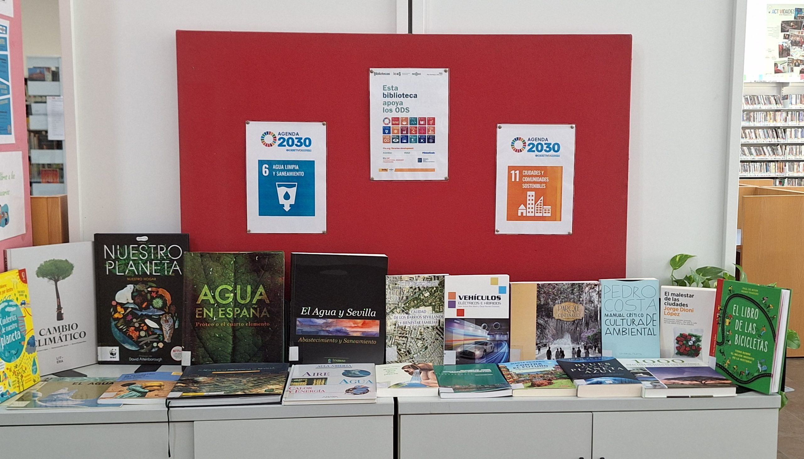 En la biblioteca Parque Alcosa nos hemos centrado en 2 objetivos, que son el nº 6 correspondiente al agua limpia y saneamiento y el nº 11 referido a las ciudades y comunidades sostenibles.
