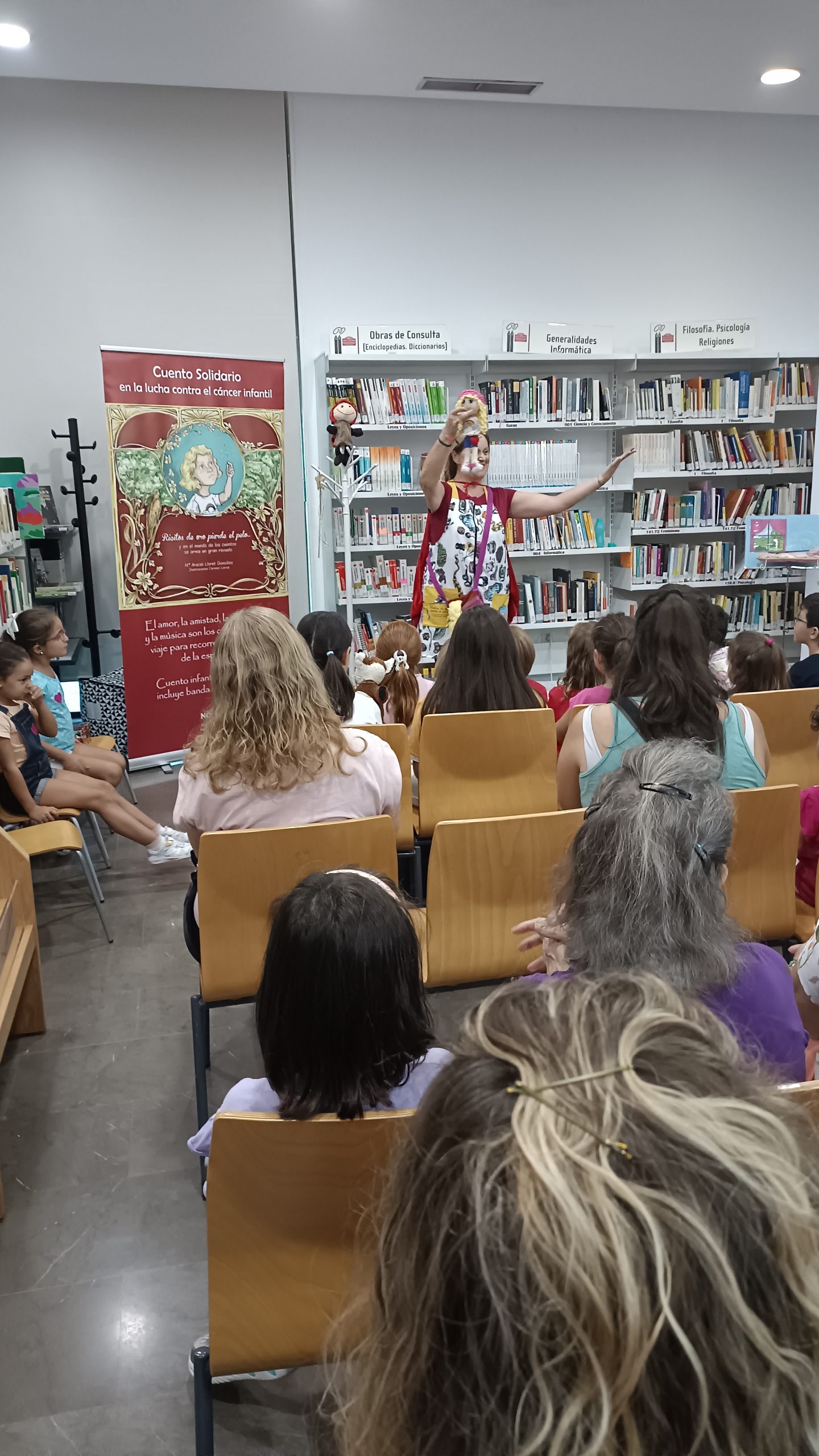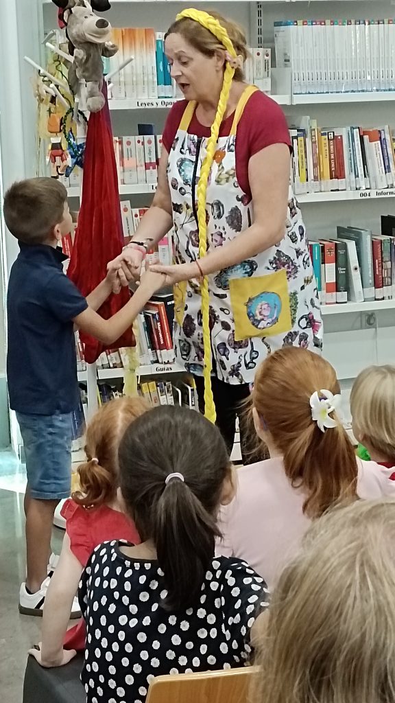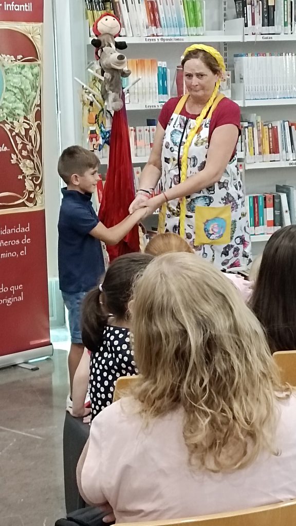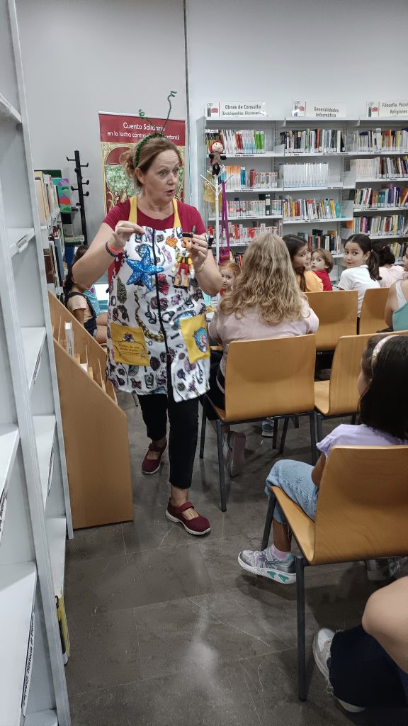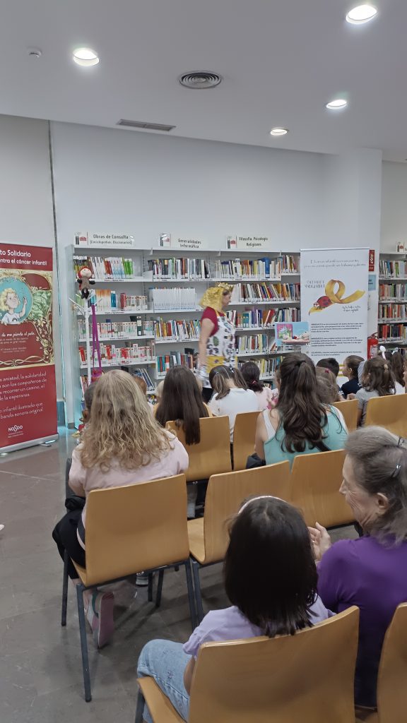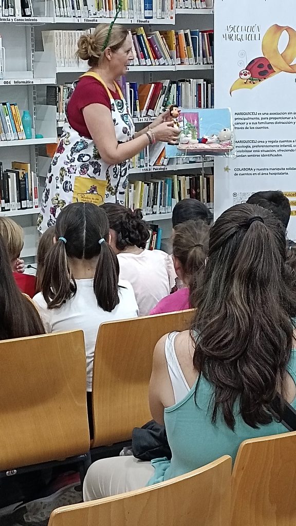 Este pasado viernes, 27 de septiembre de 2024, disfrutamos con este cuentacuentos solidario con el que desde la biblioteca queremos contribuir a la concienciación sobre el cáncer infantil. Este cuento fue contado y representado por su autora, Araceli Lloret González, presidenta de la Asociación Mariquiceli, cuyo objetivo es crear y regalar cuentos a los niños enfermos de cáncer hospitalizados. Cuentos que normalicen su situación y con los que estos niños puedan sentirse identificados. Un cuento no va a curar su enfermedad pero sin duda les ofrecerá ayuda, a ellos y a sus familias. “El cáncer infantil no es un cuento, pero un cuento puede ser bálsamo y aliento”. Ya se han regalado más de 1.500 ejemplares en hospitales de Andalucía. La Asociación quiere llegar a hospitales de toda España. Por eso necesitan nuestra ayuda para conseguir financiación para nuevas ediciones.