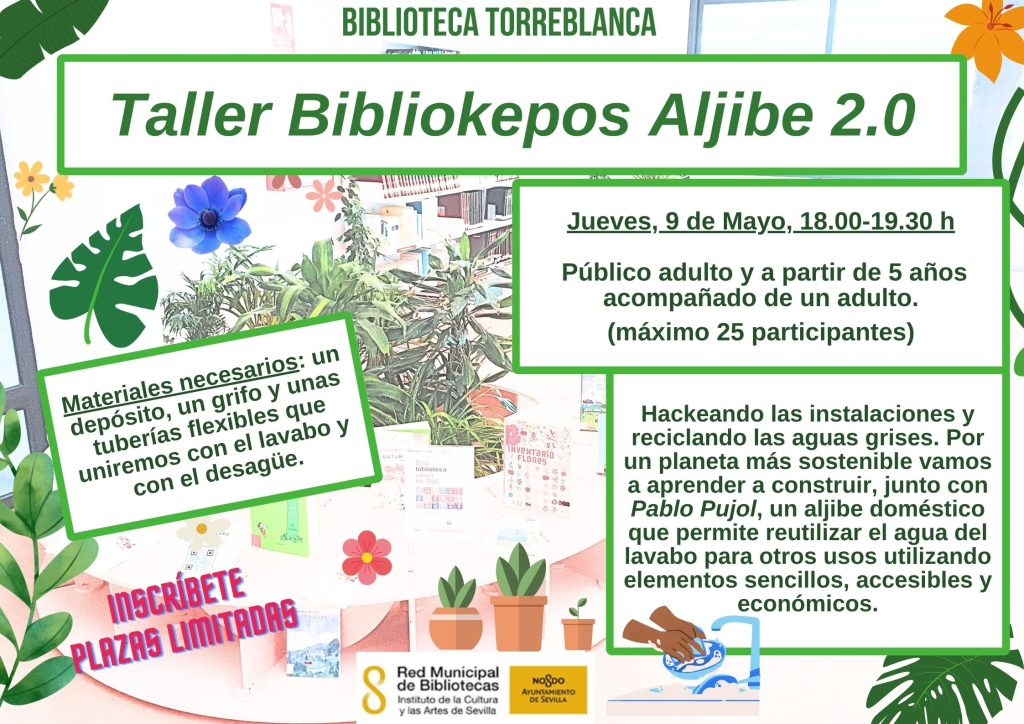 Y en este entorno se ofertan tres talleres dentro de su programación de actividades para el año 2024 con 3 talleres sostenibles dedicados a sensibilizar la problemática medioambiental en la que vivimos. En uno de ellos elaboraremos un jabón de manos natural, para dar a paso a la construcción de un aljibe doméstico para reutilizar el agua de lavabo para otros usos y finalizaremos con un paseo botánico por la biblioteca. 2 en horario de tarde y 1 en horario de mañana.