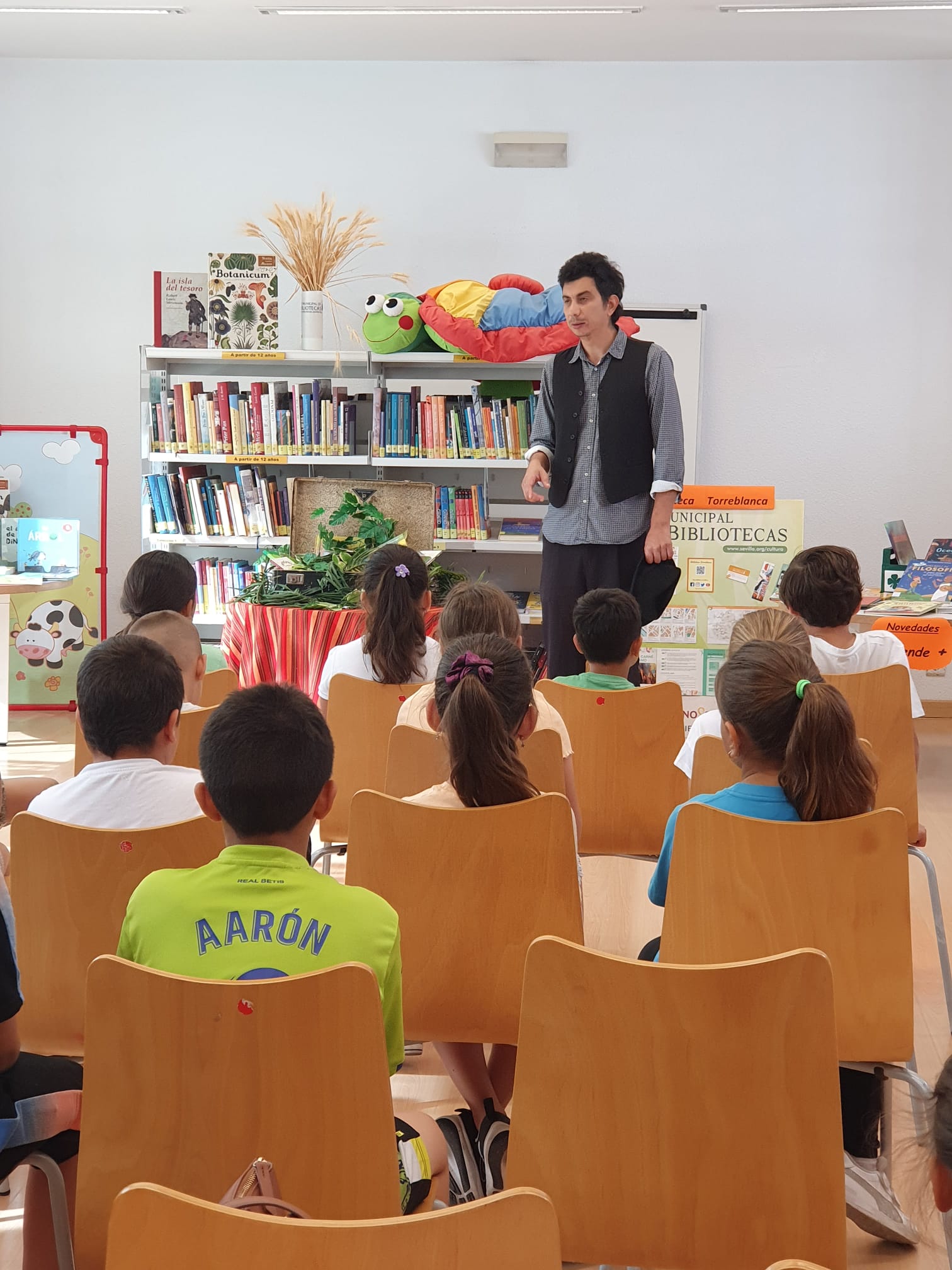 La biblioteca del barrio de Torreblanca ha tenido una mañana llena de historias y cuentos de temática ambiental que nos ha hecho recordar la importancia de cuidar nuestro entorno. Nuestro amigo Jhon Ardila nos ha llevado a verdes campos, a verdes flores, a verdes seres, a verdes árboles… y el alumnado de 3º y 4º de Primaria del CEIP Tierno Galván y 1º de Primaria del Colegio Santa María de los Reyes ha podido oler, disfrutar, conocer y reírse con verdes cuentos.